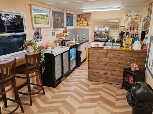Great welcome awaits you at Coffi Gallery, where you can enjoy great coffee and home-made cakes, with great views overlooking the sea and local artwork inside the cabin.